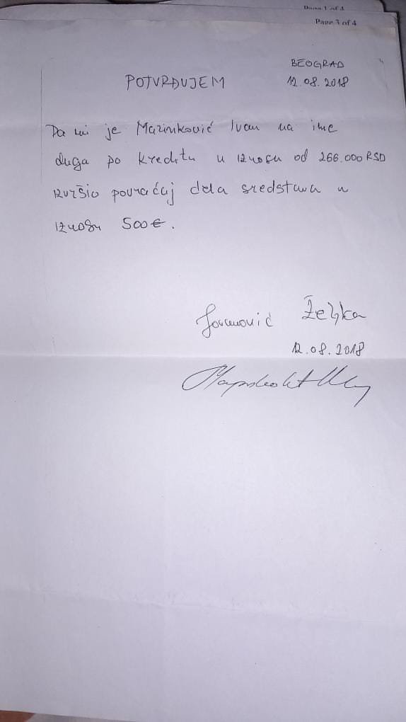 Takođe, Željka je potpisala papir u kom je potvrdila da joj je Ivan na ime otplate duga za kredit 2018. godine uplatio samo 500 evra, iako je dug mnogo veći.