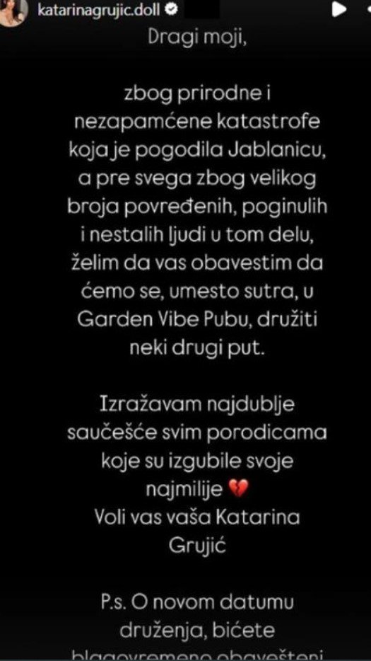 - Izražavam najdublje saučešće svim porodicama koje su izgubile svoje najmilije. Voli vas vaša Katarina Grujić - napisala je na svom Instagram profilu