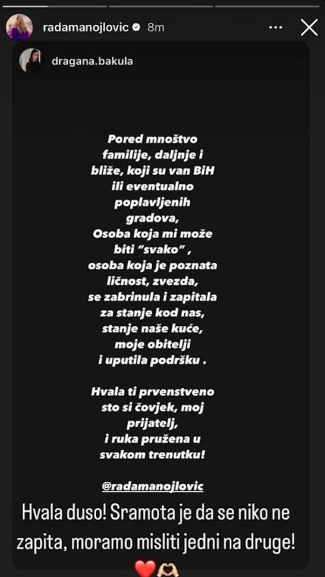 - Pored mnoštvo familije, dalje i bliže, koji su van BiH ili eventualno poplavljenih gradova, osoba koja mi može biti "svako", osoba koja je poznata ličnost, zvezda se zabrinula i zapitala za stanje kod nas, stanje naše kuće, moje porodice i uputila podršku. Hvala ti prvenstveno što si čovek, moj prijatelj, i ruka pružena u svakom trenutku - napisala je Dragana.