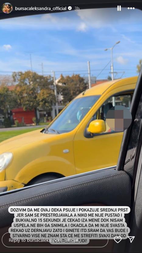- Doživim da me ovaj deka psuje i pokazuje srednji prst jer sam se prestrojavala, a niko me nije pustio i bukvalno 15 sekundi i bukvalno iza mene je čekao dok nisam uspela. Ne bih ga okačila i snimila da mi nije svašta rekao uz dernjavu zato i ginete itd... Sram da vas bude, stvarno više ne znam šta će me strefiti svaki dan od poludelih ljudi - napisala je Aleksandra u opisu videa.