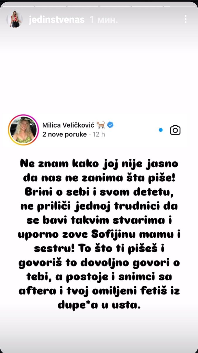 - Ne znam kako joj nije jasno da nas ne zanima šta piše! Brini o sebi i svom detetu, ne priliči jednoj trudnici da se bavi takvim stvarima i uporno zove Sofijinu mamu i sestru! To što ti pišeš i govoriš to dogovoljno govori o tebi, a postoije i snimci sa aftera i tvoj omiljeni fetiš iz dupe*a u usta. - napisano je na Sofijinom instagramu.