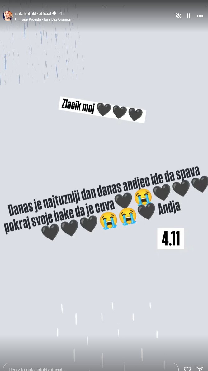 - Danas je najtužniji dan, danas anđeo ide da spava pokraj svoje bake, da je čuva - napisala je neutešna Natalija uz tužne emotikone i ime ovog anđela.