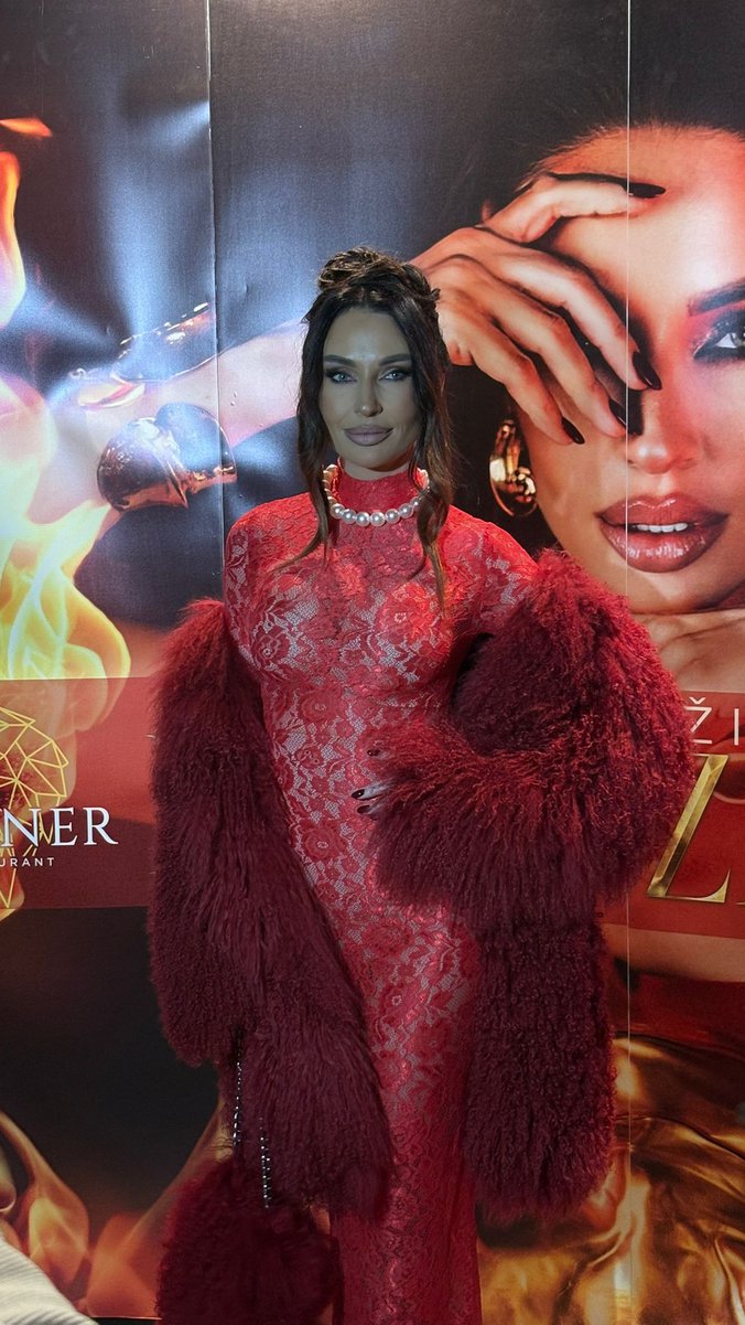 Pevačica je na parti stigla, očekivano, prva, te je zasijala u seksi haljini od crvene čipke i izmamila uzdahe prisutnih fotoreportera.