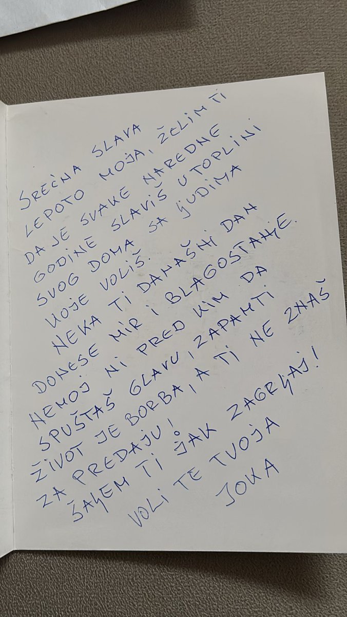 - Srećna slava lepoto moja, želim ti da je svake naredne godine slaviš u toplini svoga doma, sa ljudima koje voliš. .. - glasilo je u čestktki.