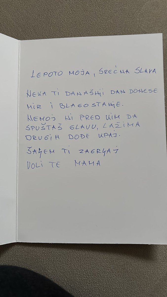 - Lepoto moja,. srećna slava. Neka ti današnji dan donese mir i blagostanje. Nemo ni pred kim da spuštaš glavu, lažima drugih dođe kraj. Šaljem ti zagrljaj. Ljubi te mama.
