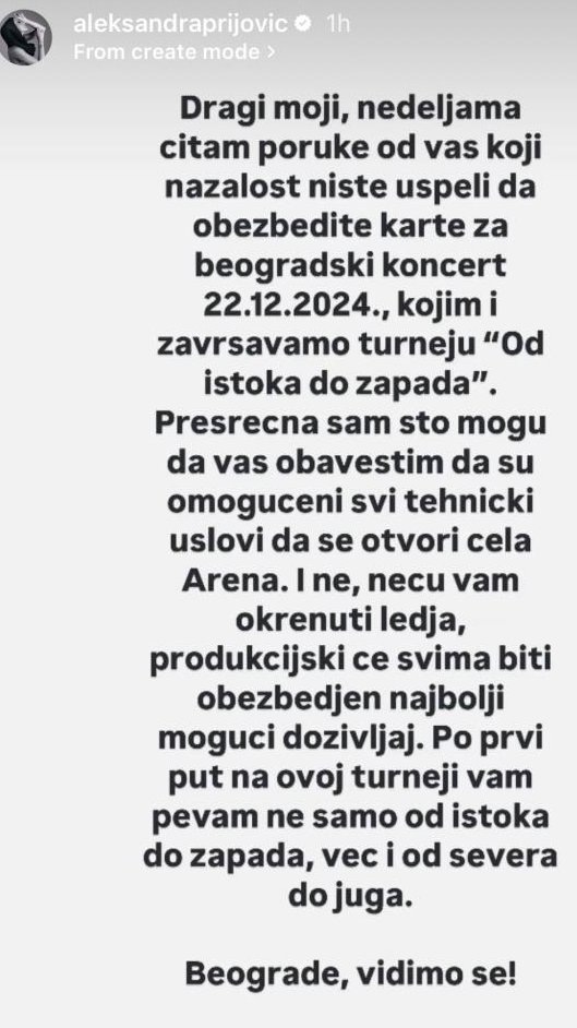 - Dragi moji, nedeljama čitam poruke od vas koji niste nažalost uspeli da obezbedite karte za beogradski koncert 22. 12. kojim i završavamo turneju "Od istoka, do zapada". Presrećna sam što mogu da vas obavestim, da su omogućeni svi tehnički uslovi da se otvori cela Arena. I ne, neću vam okrenuti leđa. Produkcijski će svima biti omogućen najbolji mogući doživljaj. Po prvi put na ovoj turneji vam, pevam, ne samo "Od istoka, do zapada", već i "Od severa, do Juga". Beograde, vidimo se - napisala je Prijovićka na Instagramu i oduševila pratioce.