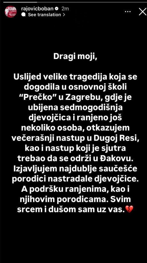 - Usled velike tragedije koja se dogodila u Osnovnoj školi "Prečko" u Zagrebu, gde je ubijena sedmogodišnja devojčica i ranjeno još nekoliko osoba, otkazujem večerašnji nastup u Dugoj Resi, kao i nastup koji je sutra trebalo da se održi u Đakovu ' napisao je i dodao: