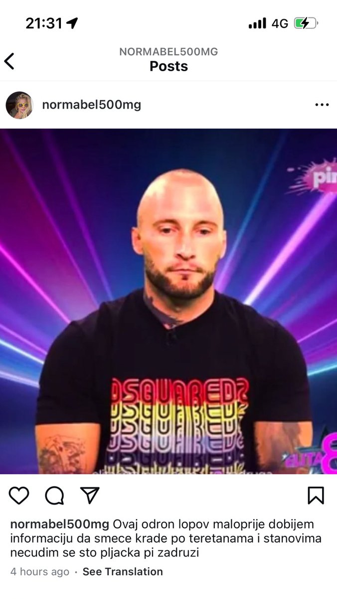 - Ovaj odron, lopov, malopre dobijem informaciju da smeće krade po teretanama i stanovima. Ne čudim se što pljačka po Zadruzi - napisala je Jasmina.