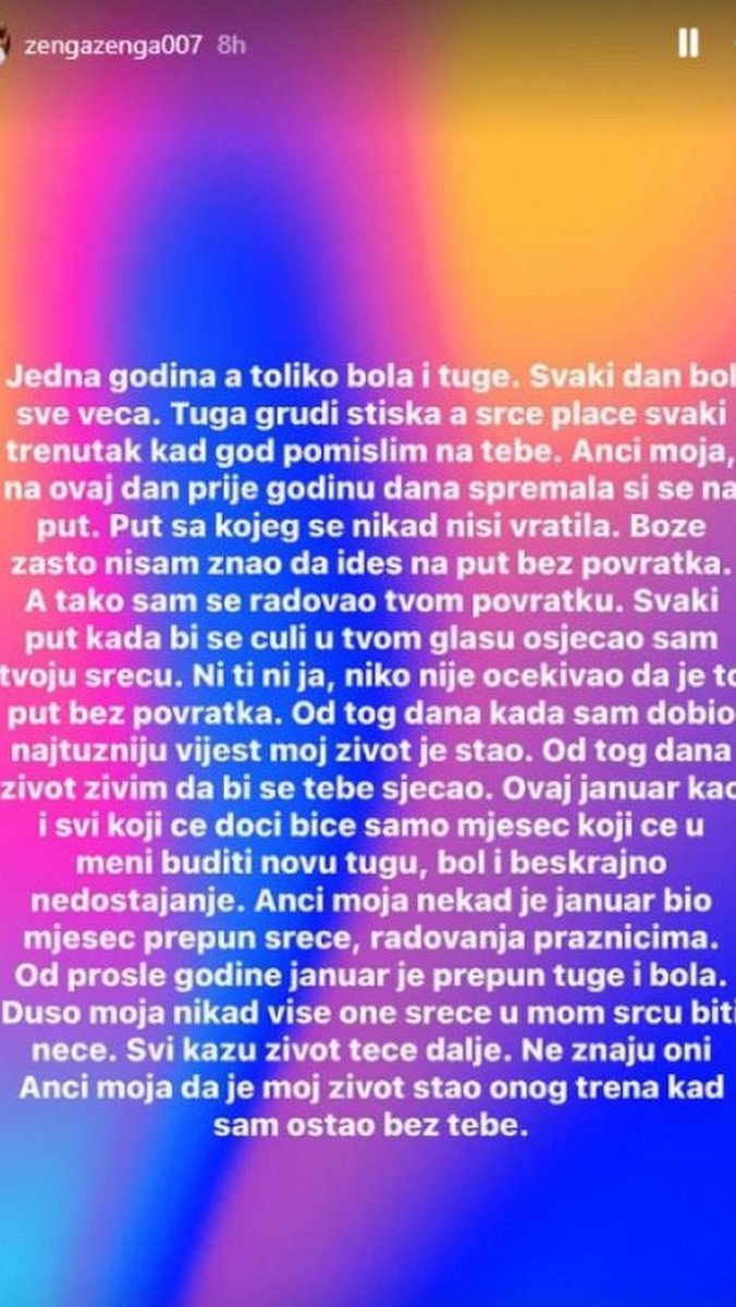 - Jedna godina, a toliko bola i tuge. Svake godine bol se pogoršava, tuga mi stišće grudi i srce mi plače svakog trenutka kada pomislim na tebe. Anči moj, na današnji dan pre godinu dana si se spremala za put. Put sa kojeg se nikada nisi vratila. Bože, zašto nisam znao da ideš na put bez povratka? I tako sam se radovao tvom povratku. Svaki put kada smo razgovarali čuo sam sreću u tvom glasu. Ni ti, ni ja ni niko nije očekivao d aje to put bez povratka. Od tog dana kada sam dobio najtužniju vest , moj život je stao. Od tog dana živim svoj život da te se sećam - napisao je on pa dodao: