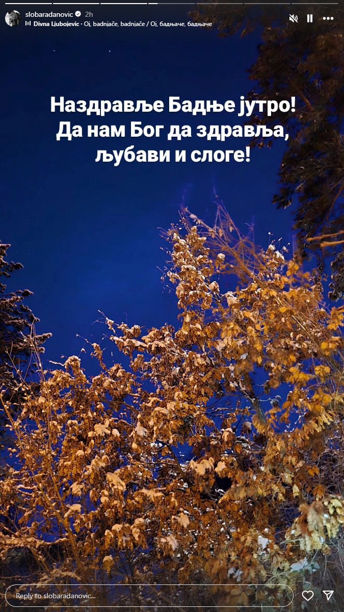 Kao i svake godine, pevač se ranom zorom uputio ka šumi, gde je otišao po badnjak kao što i nalaže stari srpski običaj, koji Sloba godinama poštuje. Pevač je na društvenoj mreži Instagram, svim vernicima hrišćanske veroispovesti čestitao praznik.