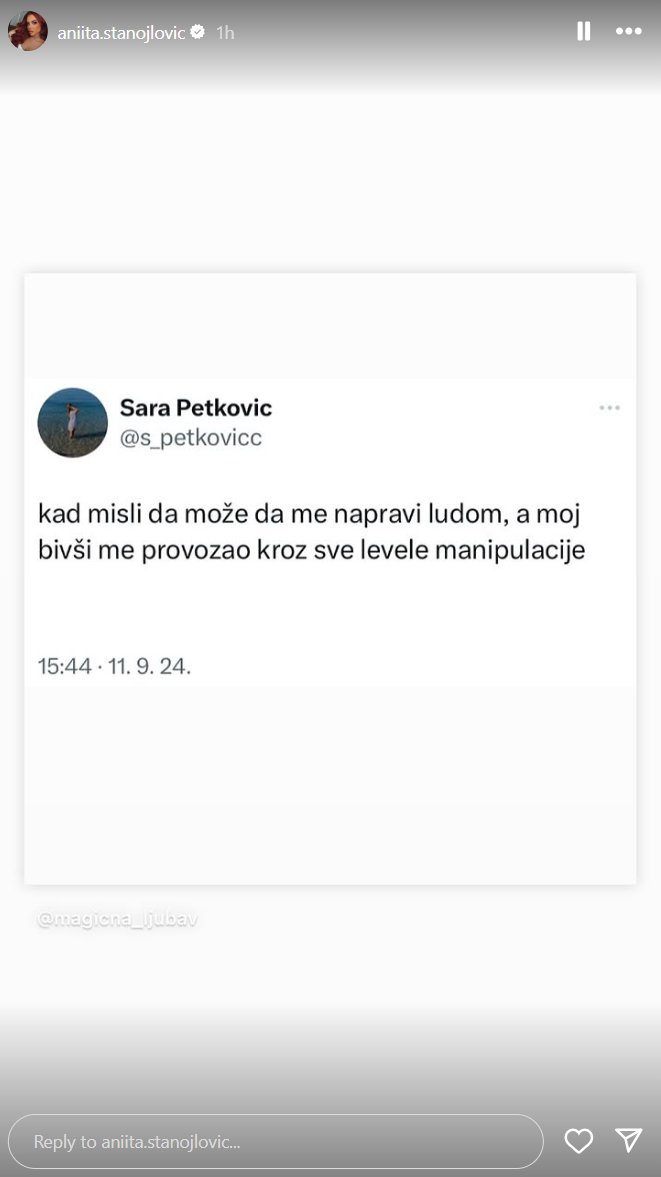- Kad misli da može da me napravi ludom, a moj bivši me provozao kroz sve levele manipulacije - poručila je Anita putem Instagrama, a Rankoviću se ovo zasigurno nimalo neće dopasti.