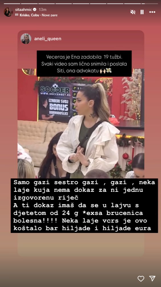 - Samo gazi sestro gazi, gazi, neka laje kuja nema dokaz za ni jednu izgovorenu reč, a ti dokaz imas da se u lajvu sa detetom od 24 god se*sa bručenica bolesna!!! Neka laje večeras je ovo koštalo bar hiljade i hiljade eura! - napisala je Sita, na svom Instagram nalogu. Gde je takođe napisala kako je za Enu spremila 19 tužbi.