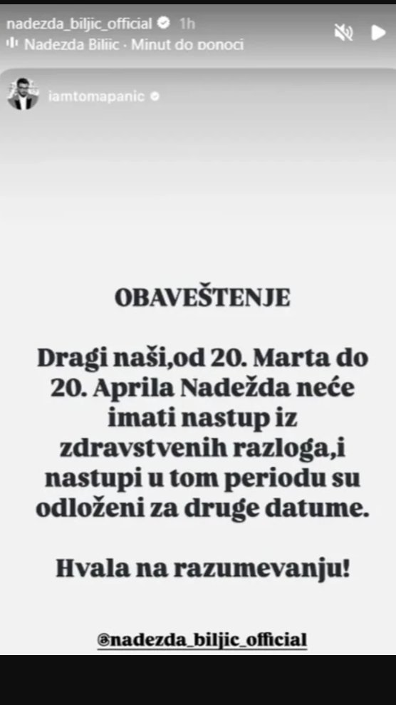 - Dragi naši, od 20. marta do 20. aprila Nadežda neće iamti nastupe iz zdravstvenih razloga, i nastupi u tom periodu su odloženi za druge datume - napsiao je Toma, a pevačica je sve podelila i na svom profilu.