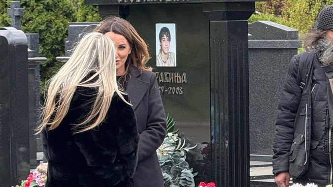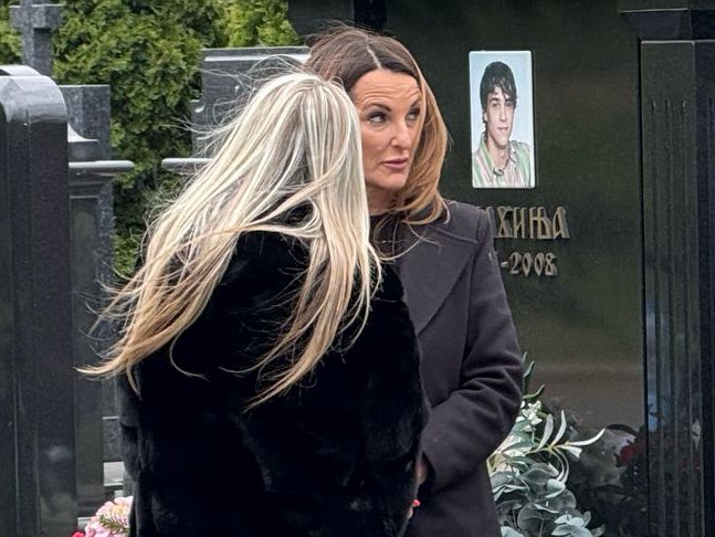 Posle sređivanja groba na kojem je rano jutros promenjena slika, Jelena je iznela sveži venac cveća i postavila ga na grob. Ova misteriozna žena nakon toga uslikana je kako razgovara sa udovicom Saše Popovića, Suzanom Jovanović, a ko je ova žena, ostaje nam da saznamo.