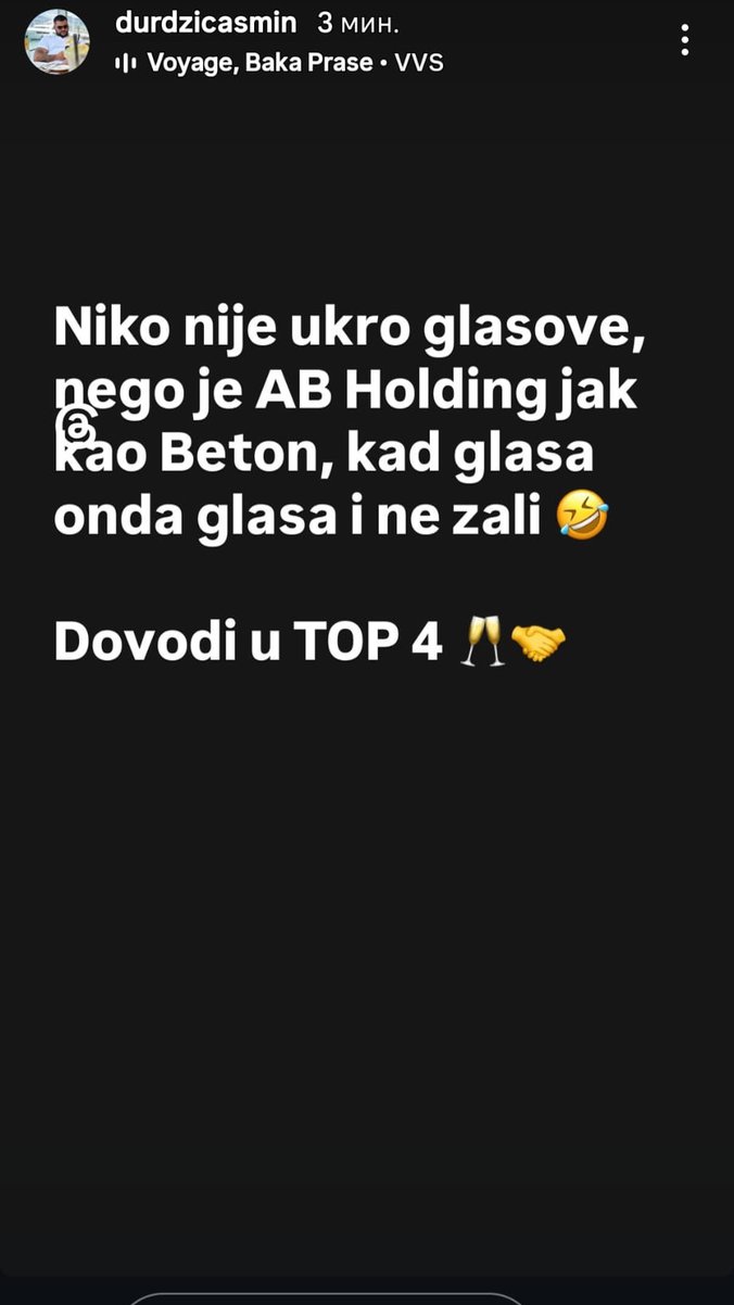 - Niko nije ukrao glasove, nego je AB Holding jak kao beton, kad glasa onda glasa i ne žali. Dovodi u top 4 - poručio je Asmin putem Instagrama.