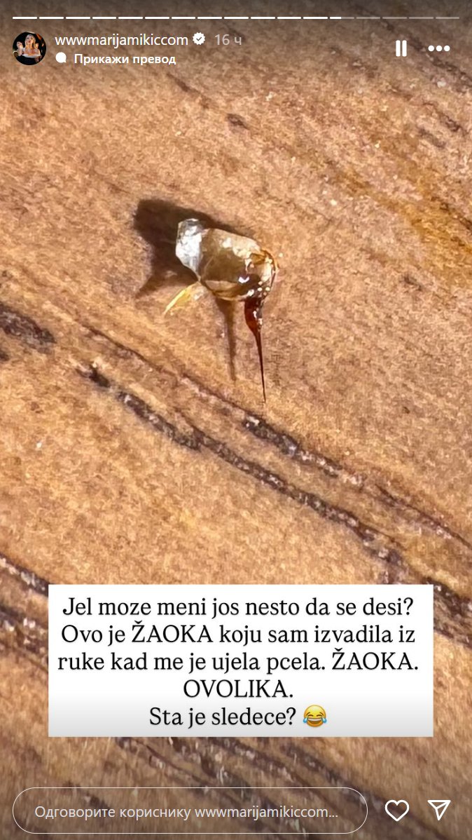 "Jel može meni još nešto da se desi? Ovo je žaoka koju sam izvadila iz ruke kada me je ujela pčela. Žaoka ovolika. Šta je sledeće?" - napisala je Marija i objavila sliku.
