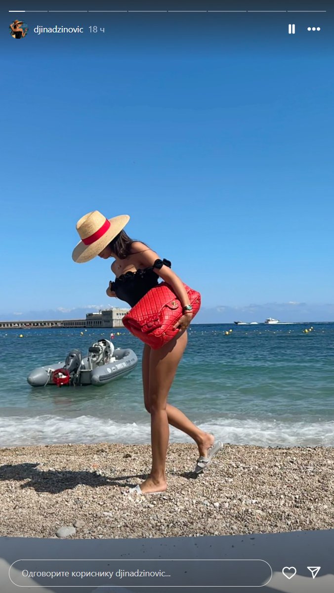 Đina na svom Instagramu deli često sadržaj sa luksuznih putovanja, a sada je fotografijom sa plaže sve iznenadila. Naime, Đina je pozirala u crnom kupaćem kostimu, lice je sakrila slamenim šeširom sa crvenim detaljima, a u ruci je nosila skupocenu "Šanel" torbu čija se cena kreće i do 14.000 evra.