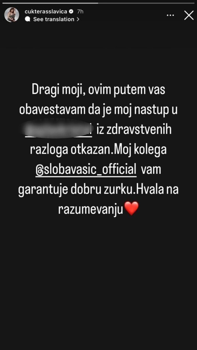 - Dragi moji, ovim putem vas obaveštavam da je moj nastup iz zdravstvenih razloga otkazan. Moj kolega Sloba Vasić vam garantuje dobru žurku. Hvala na razumevanju - napisala je Slavica Ćukteraš.