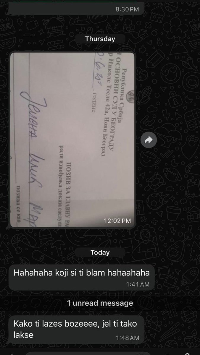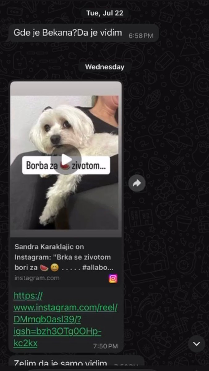 Nakon toga, Ivan je poslao brojne videe na kojima su drugi kućni ljubimci, kako bi joj stavio do znanja da želi da vidi Beku, a kada je video da to nije urodilo plodom, slikao joj je sudski poziv i poručio joj da je blam.