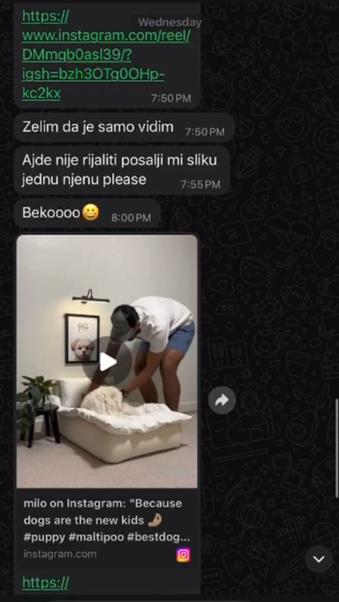 Gde je Bekana? - napisao je on u nadi da će mu Jelena proslediti sliku ljubimca, ali to se nije desilo, te je on na drugi način pokušao da je ''smekša''.