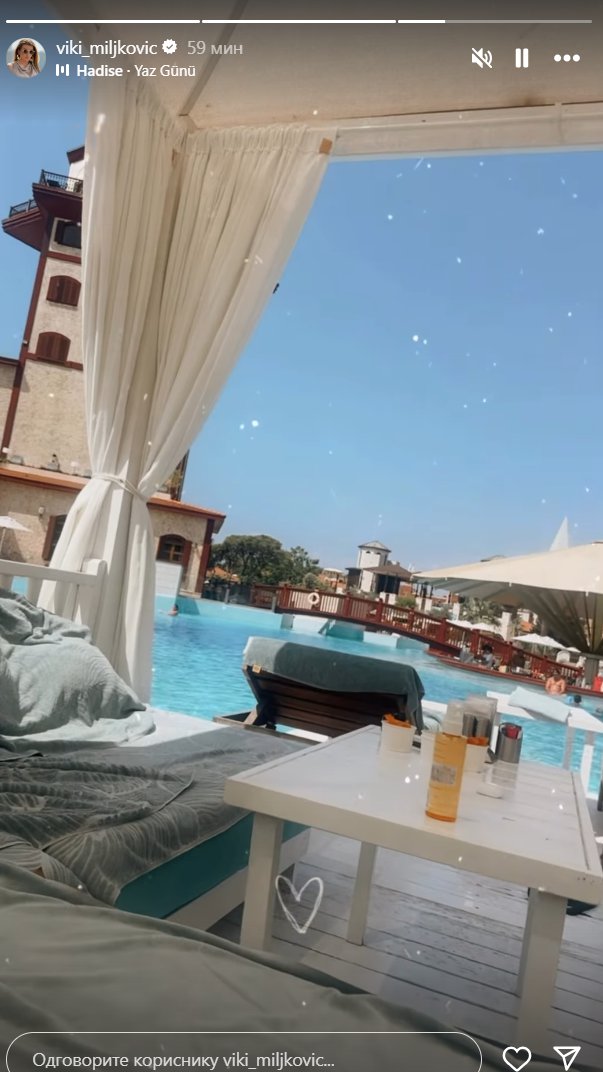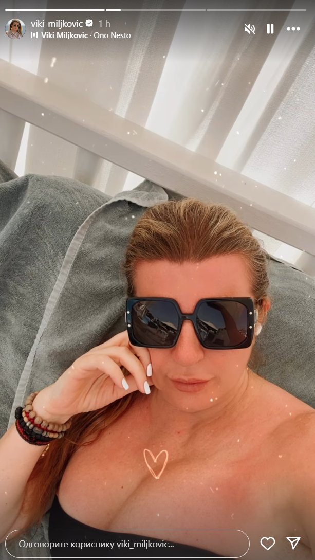 Pevačica Viki Miljković biće jedna od ćlanova stručn og žirija u muzičkom takmićenju "Pinkove zvezde", a sada je iskoristila trenutak da se dobro odmori pred povratak na posao.