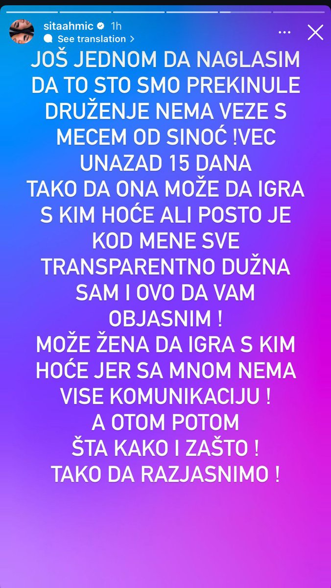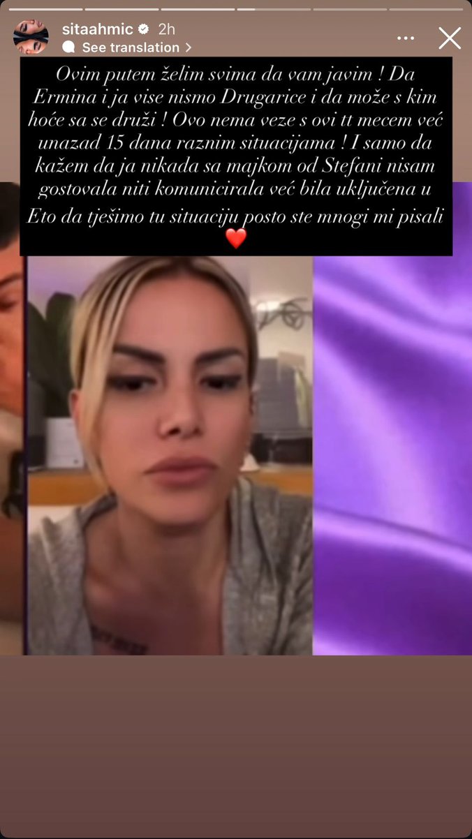 - Ovim putem želim svima da vam javim da Ermina i ja više nismo drugarice i da može sa kim hoće da se druži! I samo da kažem da ja nikada sa majkom od Stefani nisam gostovala, niti komunicirala, već bila uključena. Eto da rešimo tu situaciju pošto ste mi mnogi pisali - poručila je Sita i dodala da ipak meč sa Enom i Pejom nije bi razlog, već da već neko vreme među njima postoje određene nesuglasice: