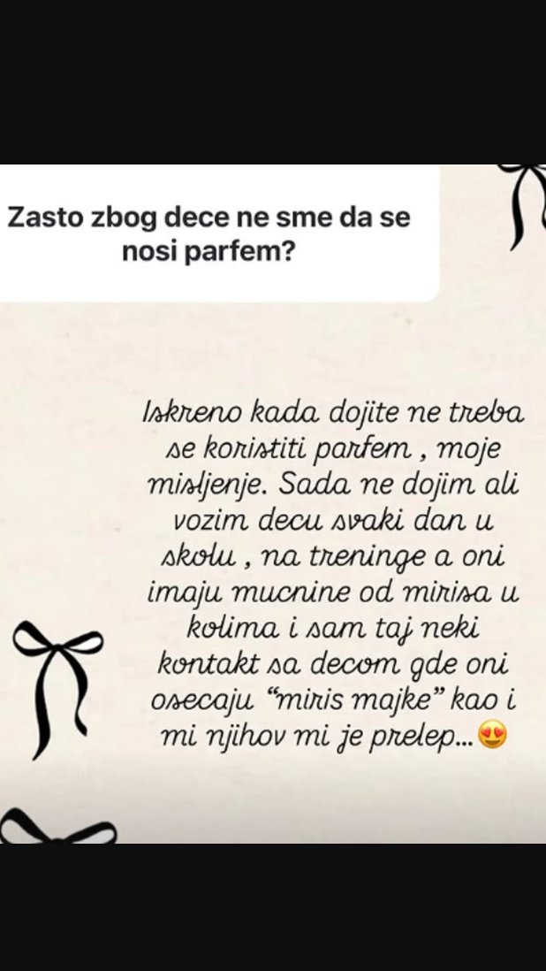 - Iskreno kada dojite ne treba da koristite parfem, moje mišljenje. Sada ne dojim, ali vozim decu svaki dan u školu, na treninge, a oni imaju mučnine od mirisa u kolima i sam taj neki kontakt sa decom gde oni osećaju "miris majke" kao i mi njihov je prelep - napisala je ona.
