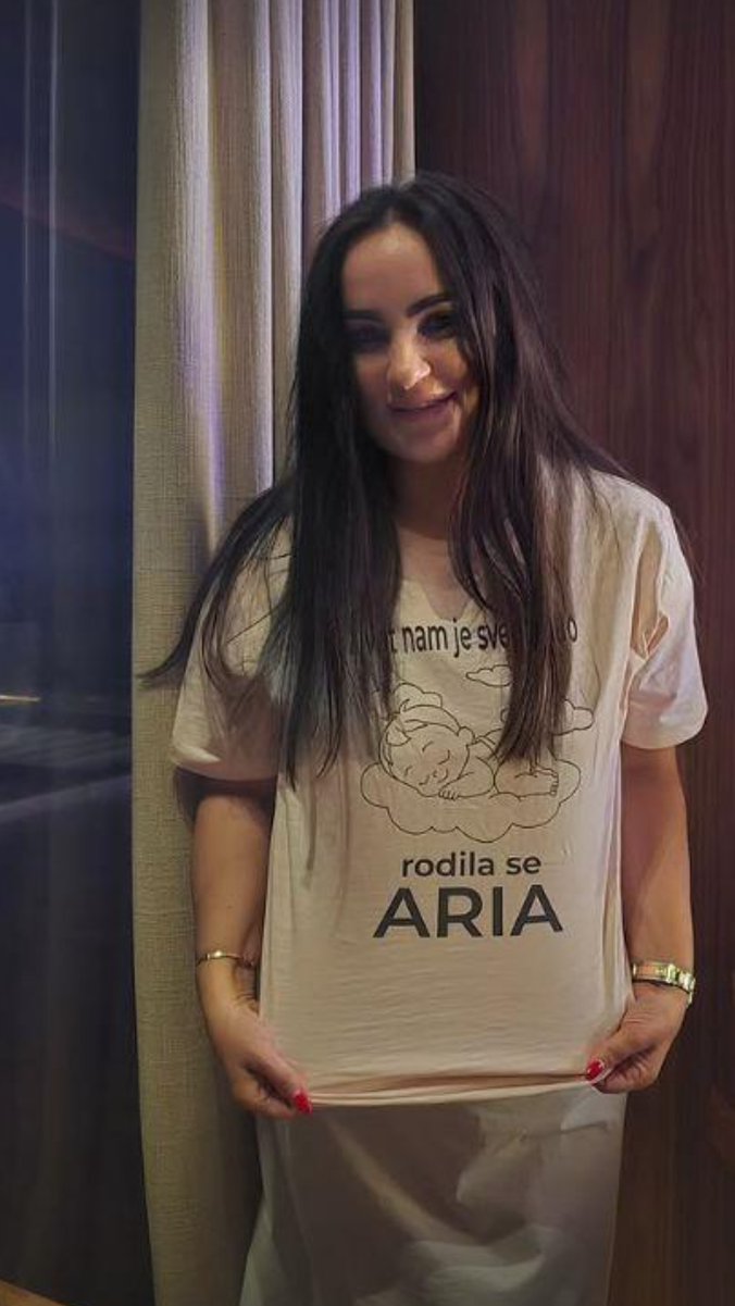Aleksandrina majka Borka bila je puna sreća zbog dolaska unuke na svet, a na Instagramu je pozirala u majici koja je bila specijalno napravljena za ovu priliku. Uz crtež bebe, na majici je pisalo: