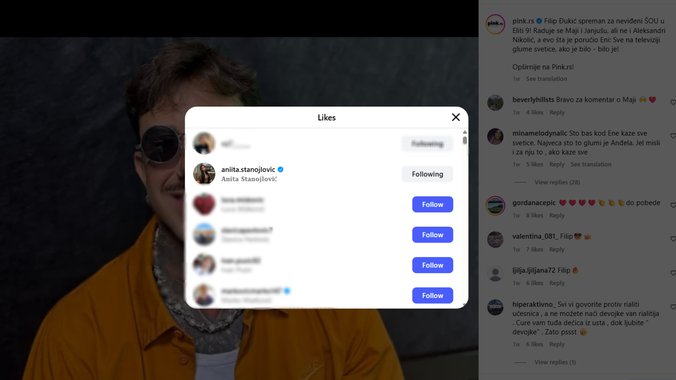 Međutim, izgleda da Anita i dalje prati šta Filip radi, pa je tako na našoj Instagram objavi ostavila lajk na objavi o Đukiću. Da li joj se njegova izjava samo dopala jer je rekao da bi više voleo nju da sretne nego Enu Čolić u "Eliti 9" ili ipak i dalje nije imuna na njega, ostaje da saznamo u nekom od njenih oglašavanja.