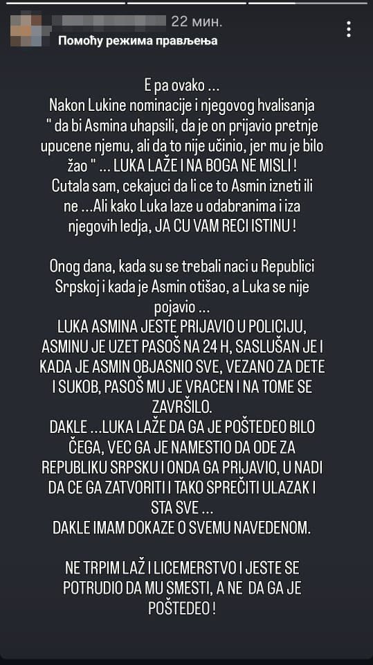 - E pa ovako... Nakon Lukine nominacije i njegovog hvalisanja "da bi Asmina uhapsili, da je on prijavio pretnje upućene njemu, ali da to nije učinio, jer mu je bilo žao"... Luka laže i na Boga ne misli! Ćutala sam, čekajući da li će to Asmin izneti ili ne... Ali kako Luka laže u odabranima i iza njegovih leđa, ja ću vam reći istinu!