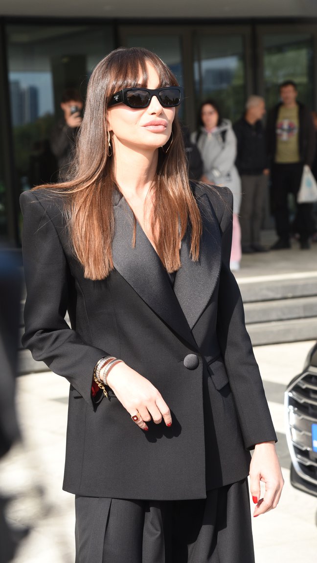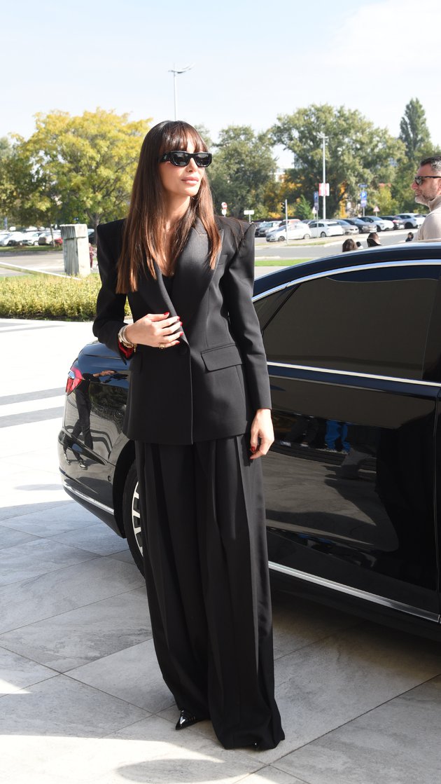 Ona je obukla elegantno crno odelo koje je uparila sa visokim potpeticama, a kroj ovog kompleta je toliko neobičan da savršeno pokazuje dozu stila.
