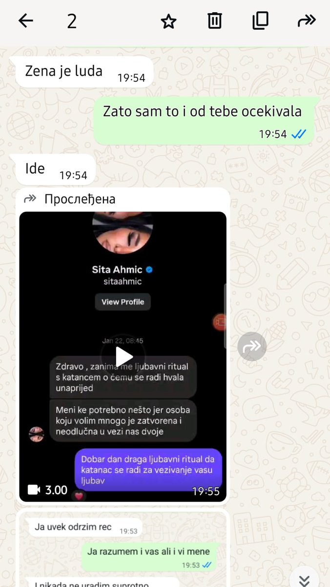 Naime, reč je o prepiskama između jedne žene i vračare koju je Sita kontaktirala, a o kojoj smo pisali, detaljnije u linku iznad, u kojoj vračara potvrđuje autentičnost poruka sa Sitom Ahmić na snimku koji smo objavili, s obzirom na to da Sita putem društvenih mreža demantuje da se ovo zapravo dogodilo.