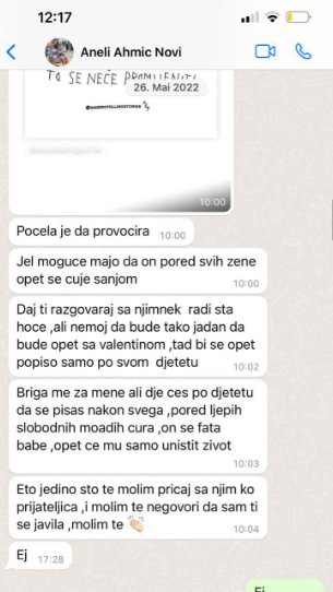 - Je l' moguće da se on pored svih žena ponovo čuje sa Sanjom? Daj ti razgovaraj sa njim. Nek radi šta hoće, ali nemoj da bude tako jadan da bude opet sa Valentinom, tad bi se opet popi*ao po svom detetu. Briga me za mene, ali gde ćeš po detetu da pi*a* nakon svega?! Pored lepih, slobodnih, mladih cura, on se hvata za babe. Opet će mu samo uništiti život. Eto jedino što te molim, pričaj sa njim kao prijateljica. I molim te, ne goviri da sam ti se javila, molim te - napisala je Aneli.