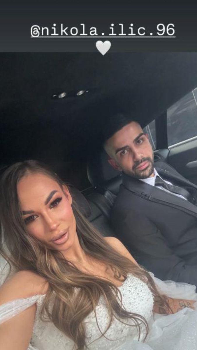 Ana je objavila fotografiju sa Nikolom iz automobila, a kako možemo videti, ona je odabrala elegantnu belu venčanicu sa tilom dok je gornji deo od cirkona. Nikola je bio u crnom smokingu sa kravatom.