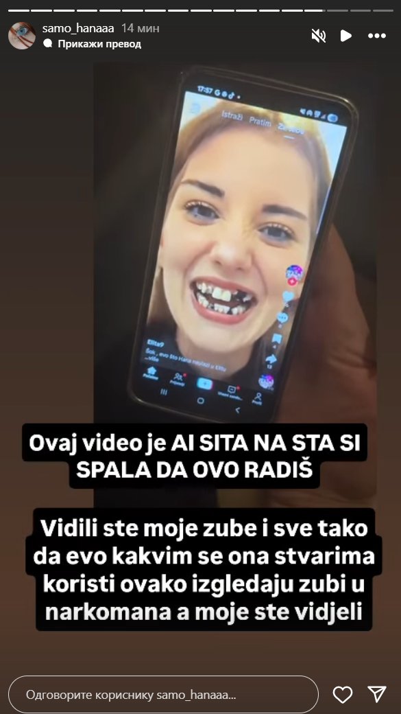 - Ovaj video je AI, Sita na šta si spala da ovo radiš. Videli ste moje zube i sve, tako da evo kakvim se ona stvarima koristi. Ovako izgledaju zubi kod narkomana, a moje ste videli -napisala je Hana na jednoj od objava, a onda je usledio još jedan demant.