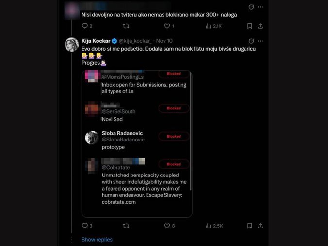 Pevačica Katarina Živković i bivša rijaliti učesnica Kija Kockar, njena nekadašnja prijateljica, već danima vode medijski rat. Kija se sada oglasila na društvenoj mreži "X" gde je pokazala listu svih korisnika koje je tu blokirala.