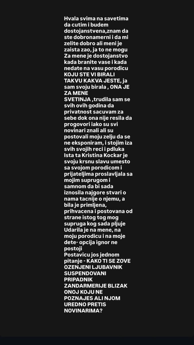 - Hvala svima na savetima da ćutim i budem dostojanstvena, znam da ste dobronamerni i da mi želite dobro ali meni je zaista žao, ja to ne mogu. Za mene je dostojanstvo kada branite vaše i kada ne date na vašu porodicu KOJU STE VI BIRALI TAKVU KAKVA JESTE, ja sam svoju birala, ONA JE ZA MENE SVETINJA, trudila sam se svih ovih godina da privatnost sačuvam za sebe dok ona nije rešila da progovori iako su svi novinari znali ali su poštovali moju želju da se ne eksponiram, i stojim iza svih svojih reči i odluka. Ista ta Kristina Kockar je svoju krsnu slavu umesto sa svojom porodicom i prijateljima proslavljala sa mojim suprugom i sa mnom da bi sada iznosila najgore stvari o nama tačnije o njemu, a bila je primljena, prihvaćena i poštovana od strane istog tog mog supruga kog sada pljuje. Udarila je na mene, na moju porodicu i na moje dete – opcija ignor ne postoji napisala je pevačica i dodala: