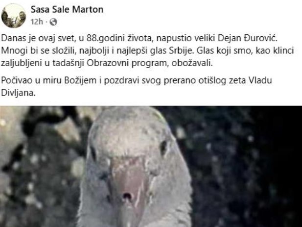 Od Dejana Đurovića oprostio se i Aleksandar Marton, koji je u emotivnoj poruci istakao njegov značaj: "Danas je ovaj svet, u 88.godini života, napustio veliki Dejan Đurović. Mnogi bi se složili, najbolji i najlepši glas Srbije. Glas koji smo, kao klinci zaljubljeni u tadašnji Obrazovni program, obožavali. Počivao u miru Božijem i pozdravi svog prerano otišlog zeta Vladu Divljana".