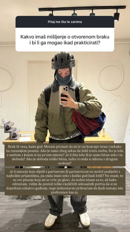 "Brak ili veza, kako god. Moram priznati da mi je taj koncept stran i nekako ne razumem poentu. Ako je samo zbog se*sa da želiš treću osobu, šta je loše s osobom s kojom si na prvom mestu? Da li je išta loše ili je samo bitan se*s i ta sloboda? Ako je sloboda toliko bitna, zašto si onda u odnosu s drugom osobom? Da li emocije koje deliš s partnerom ili partnerkom ne možeš da podeliš s najboljim prijateljima, pa onda da imaš se*s s koliko god ljudi želiš? Ne znam, to su sve pitanja koja mi se vrte po glavi. Ja nužno nisam za to, ali kako odrastam, vidim da postoji toliko različitih se*sualnih poriva da sebi ne dopuštam nikakvo gađenje, nego jednostavno prihvatam da ljudi nemaju iste preference kao ja", zaključio je Marko, a prenosi story.hr.