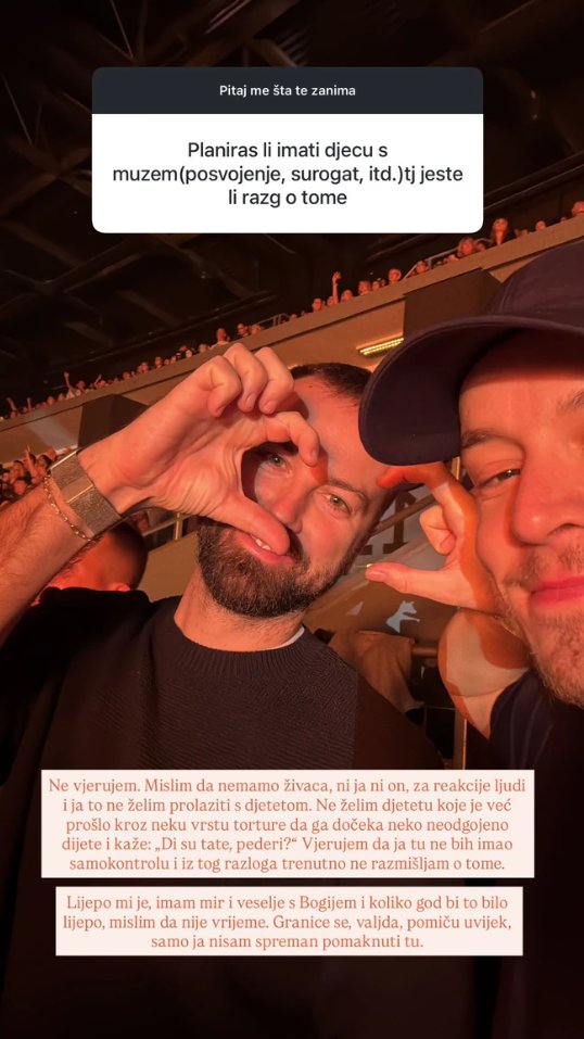 "Ne verujem. Mislim da nemamo živaca, ni ja ni on, za reakcije ljudi i ja to ne želim da prolazim s detetom. Ne želim detetu koje je već prošlo kroz neku vrstu torture da ga dočeka neko nevaspitano dete i kaže: 'Gde su ti tate, pe*eri?'. Verujem da ja tu ne bih imao samokontrolu i iz tog razloga trenutno ne razmišljamo o tome. Lepo mi je, imam mir i veselje sa Bogijem i koliko god bi to bilo lepo, mislim da nije vreme. Granice se, valjda, pomeraju uvek, samo ja nisam spreman da pomerim tu", napisao je.