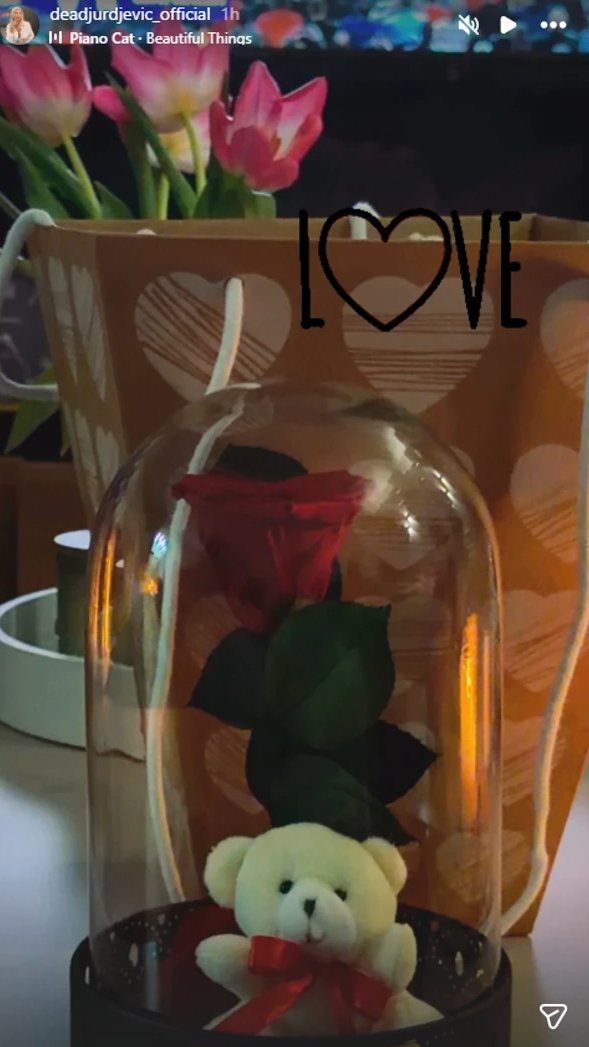 Na društvenim mrežama Dea je objavila fotografiju crvene ruže i plišanog medvedića smeštenih u staklenoj, poklopljenoj vazi.