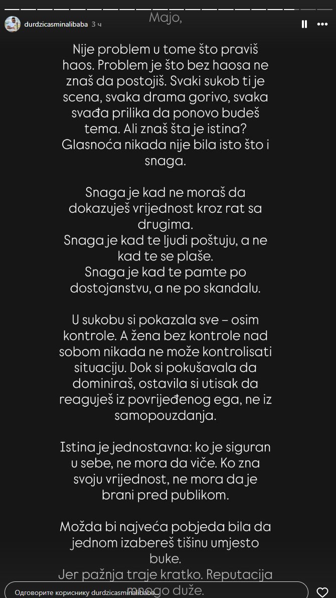 Majo, nije problem u tome što praviš haos, problem je što bez haosa ne znaš da postojiš. Svaki sukob ti je scena, svaka drama gorivo, svaka svađa prilika da ponovo budeš tema. Ali znaš šta je istina? Glasnoća nikada nije bila isto što i snaga. Snaga je kad ne moraš da dokazuješ vrijednost kroz rat sa drugima. Snaga je kad te ljudi poštuju, a ne kad te se plaše. Snaga je kad te pamte po dostojanstvu, a ne po skandalu. U sukobu si pokazala sve – osim kontrole. A žena bez kontrole nad sobom nikada ne može kontrolisati situaciju. Dok si pokušavala da dominiraš, ostavila si utisak da reaguješ iz povrijeđenog ega, ne iz samopouzdanja. Istina je jednostavna: ko je siguran u sebe, ne mora da viče. Ko zna svoju vrednost, ne mora da je brani pred publikom. Možda bi najveća pobeda bila da jednom izabereš tišinu umesto buke, jer pažnja traje kratko, a reputacija mnogo duže.