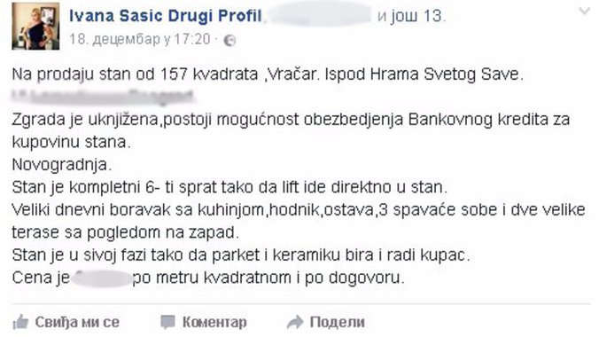 Učesnica šeste sezone najgledanijeg rijalitja u regionu ''Farma'', pevačica Ivana Šašić, prodaje vrednu nekretninu u samom centru Beograda, čime je mnoge iznenadila.