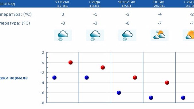 Jutarnja temperatura od minus 8 do minus 3, najviša dnevna od minus 3 do plus 2.
