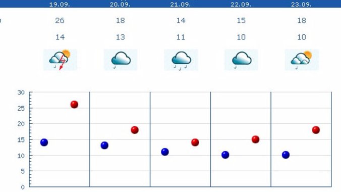 Jutarnja temperatura od 9 do 14 stepeni, a najviša dnevna od 22 na severu do 30 stepeni na jugu.