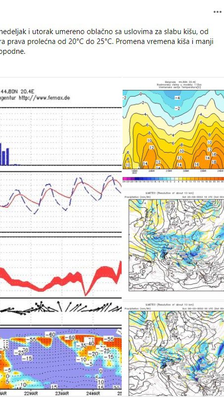 - Postepena promena vremena kreće za naredni vikend, 25. i 26. marta, kada se očekuje postepeno naoblačenje sa kišom i manjim padom temperature. Vetar u skretanju na severozapadni. Zatim do kraja marta promenljivo osetno svežije sa smenom sunca i oblaka koji će donositi kišu u nižim predelima i sneg na planinama maksimalna temperatura biće od 7°C do 12°C.