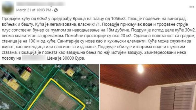 "Prodajem kuću od 60 kvadrata u predgrađu Vršca na placu od 1.000 kvadrata" stoji u oglasu na Fejsbuk stranici za kupovinu i prodaju nekretnina koji je u moru drugih odmah privukao pažnju korisnika.
