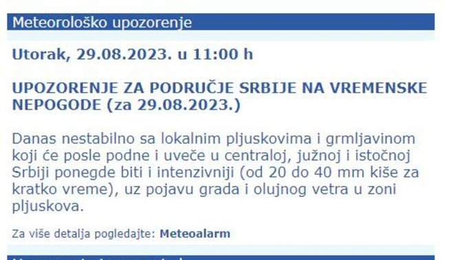 "Danas nestabilno sa lokalnim plјuskovima i grmlјavinom koji će posle podne i uveče u centraloj, južnoj i istočnoj Srbiji ponegde biti i intenzivniji (od 20 do 40 mm kiše za kratko vreme), uz pojavu grada i olujnog vetra u zoni plјuskova", navodi se u upozorenju RHMZ.