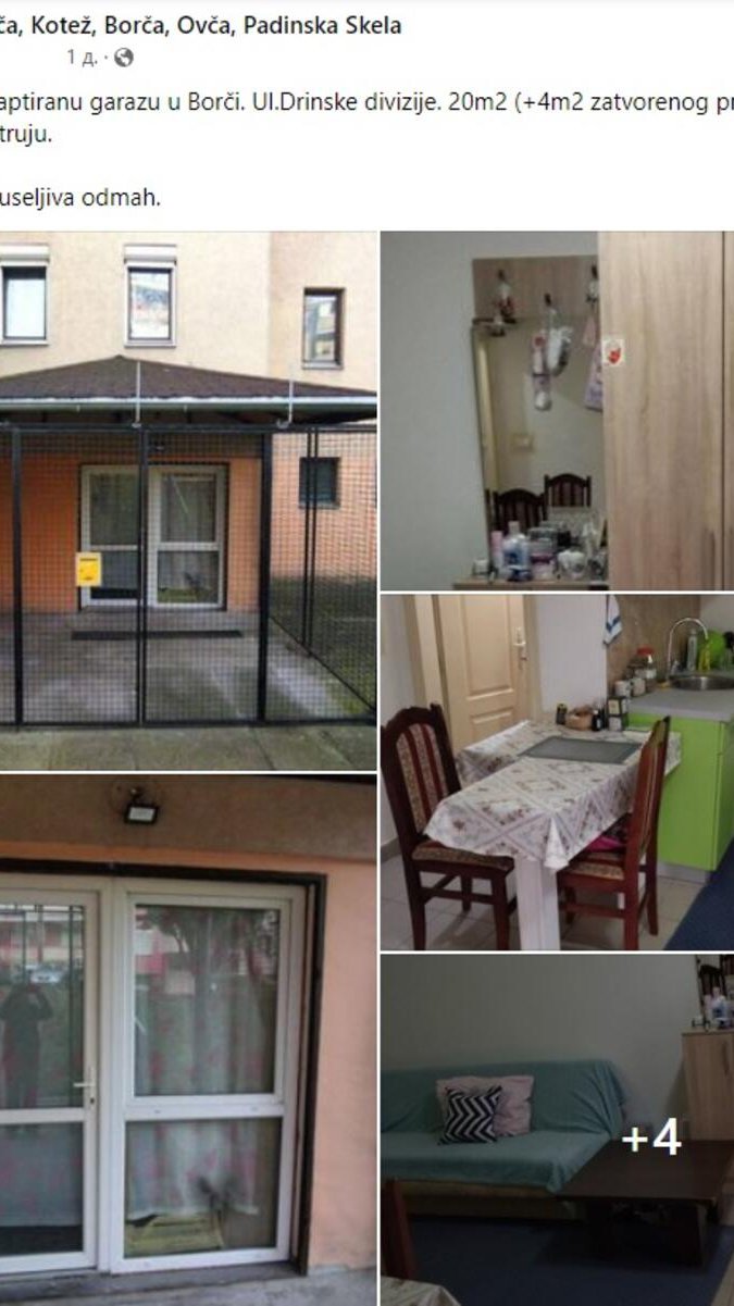 - Prodajem adaptiranu garažu u Borči. Ulica Drinske divizije. 20 kvadrata (+4 kvadrata zatvorenog prostora). Grejanje na struju. Cena 38.000 evra, renovirana i useljiva odmah - navodi se u opisu oglasa koji je objavljen u grupi "Krnjača, Kotež, Borča, Ovča, Padinska Skela".