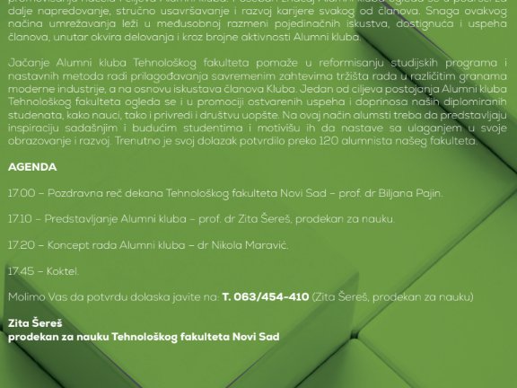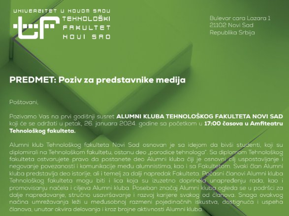 Pozivamo Vas na prvi godišnji susret ALUMNI KLUBA TEHNOLOŠKOG FAKULTETA NOVI SAD koji će se održati u petak, 26. januara 2024. godine sa početkom u 17:00 časova u Amfiteatru Tehnološkog fakulteta.